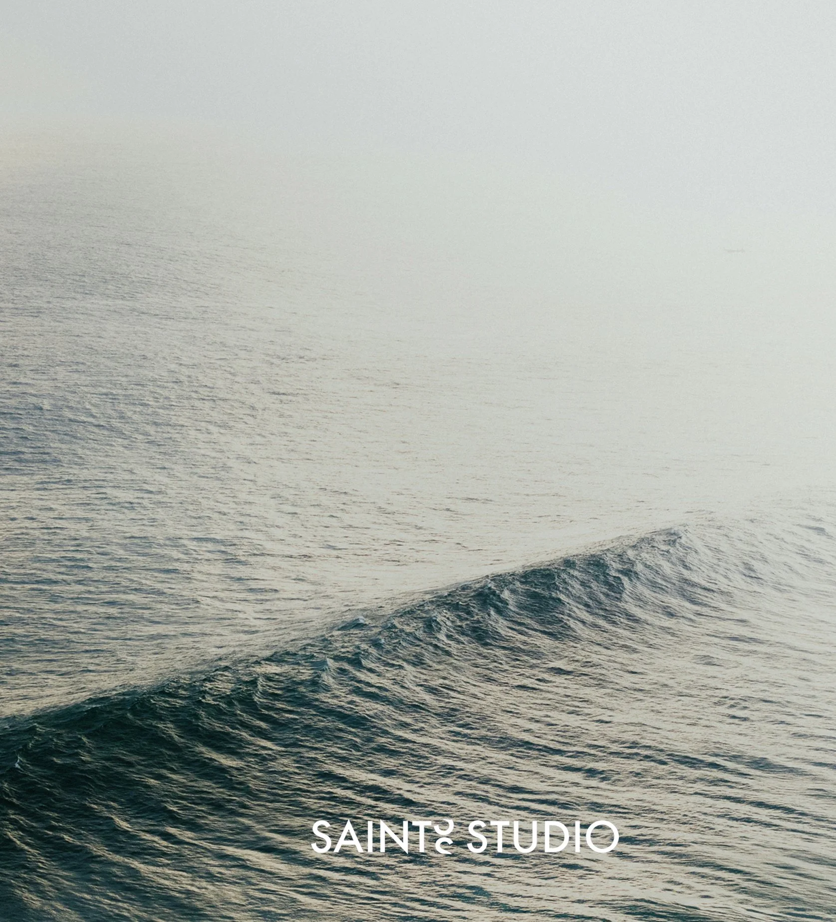 Photo of ocean waves with foggy sky, greenish water, and a logo reading 'SAINT STUDIO' at the bottom.